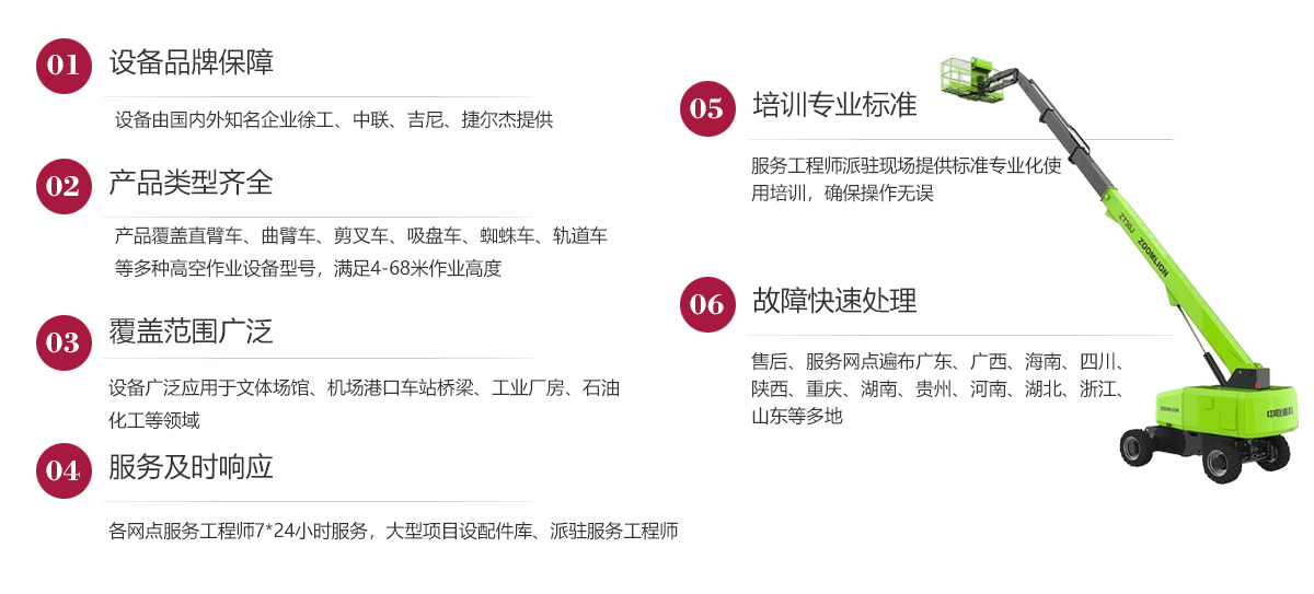 公司產(chǎn)品系列齊全,品種豐富,覆蓋了剪叉式、直臂式、曲臂式、蜘蛛式及吸盤式等多型號高空作業(yè)車,滿足4至68米各種工作高度的施工要求。設備廣泛用于工程建設、文體場館、廠房搭建,施工維護,幕墻裝飾、工程裝修、消防工程、市政工程、電力、通訊、高空管路鋪設、高架橋梁的建造、涂裝及各種大型工礦企業(yè)等場所。設備移動靈活,安全穩(wěn)定,能有效提高施工效率,降低工人勞動強度,縮短施工時間,節(jié)省施工成本,是高效安全施工的理想選擇。
